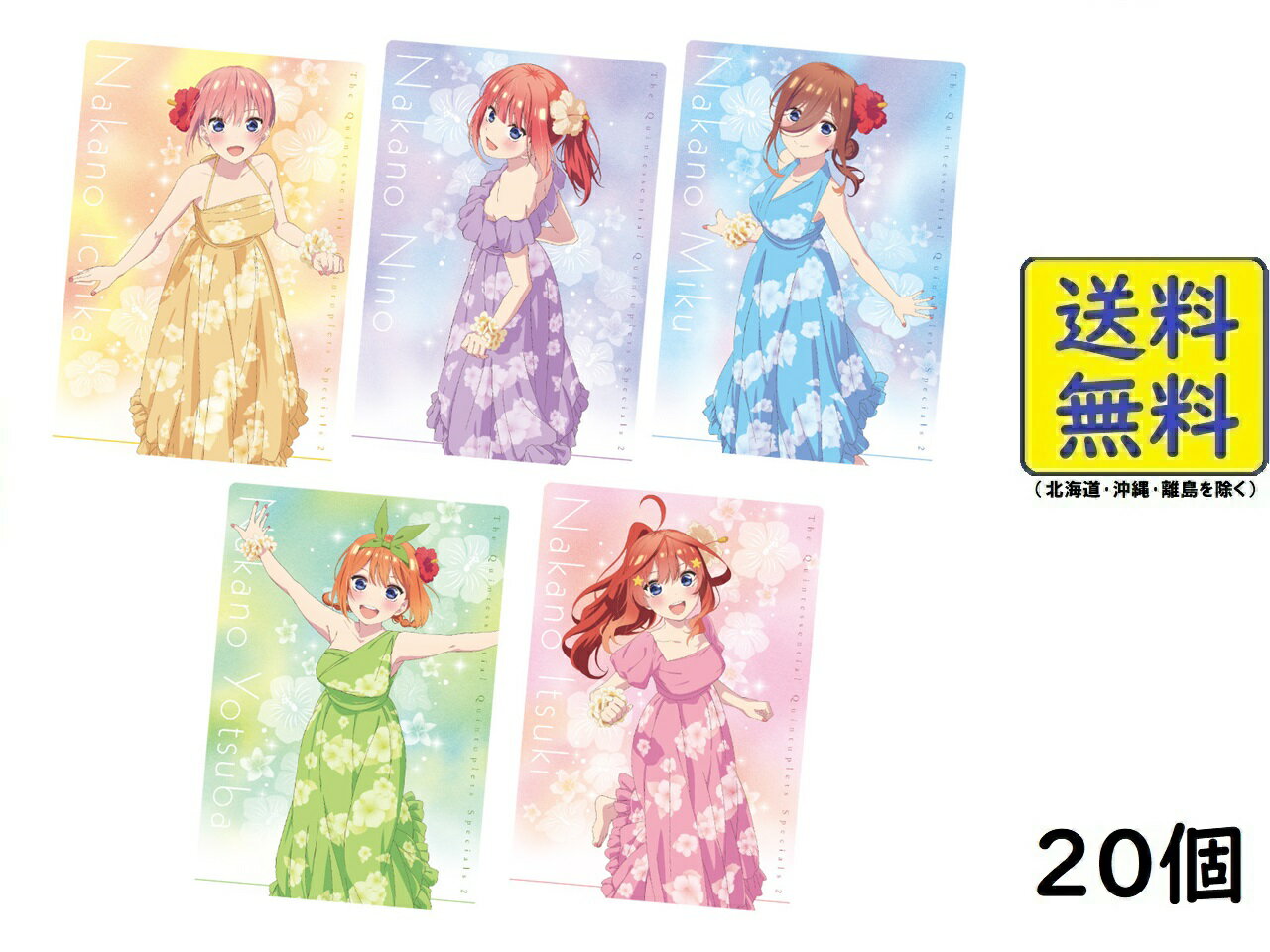 【送料無料】 五等分の花嫁*ウエハース 20個TVスペシャルアニメ「五等分の花嫁*」より、コレクションカードつきウエハースが登場!本商品オリジナルの新規描き下ろしイラストは、新婚旅行編をイメージしたオリジナルの水着姿の五つ子を収録!豪華メタリックプラカードで、スペシャルカードはホロ箔押し、ビジュアルカードは金色箔押しの特別仕様です!